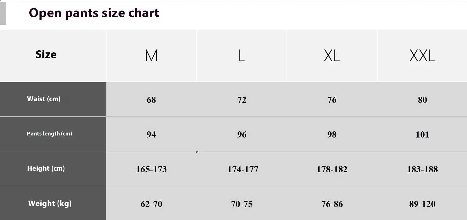 Size: M 168CM-173CM 62-70kg,L 174CM-177CM 70-75kg,XL 178CM-182CM 76-86kg,XXL 183CM-188CM 89-100kg